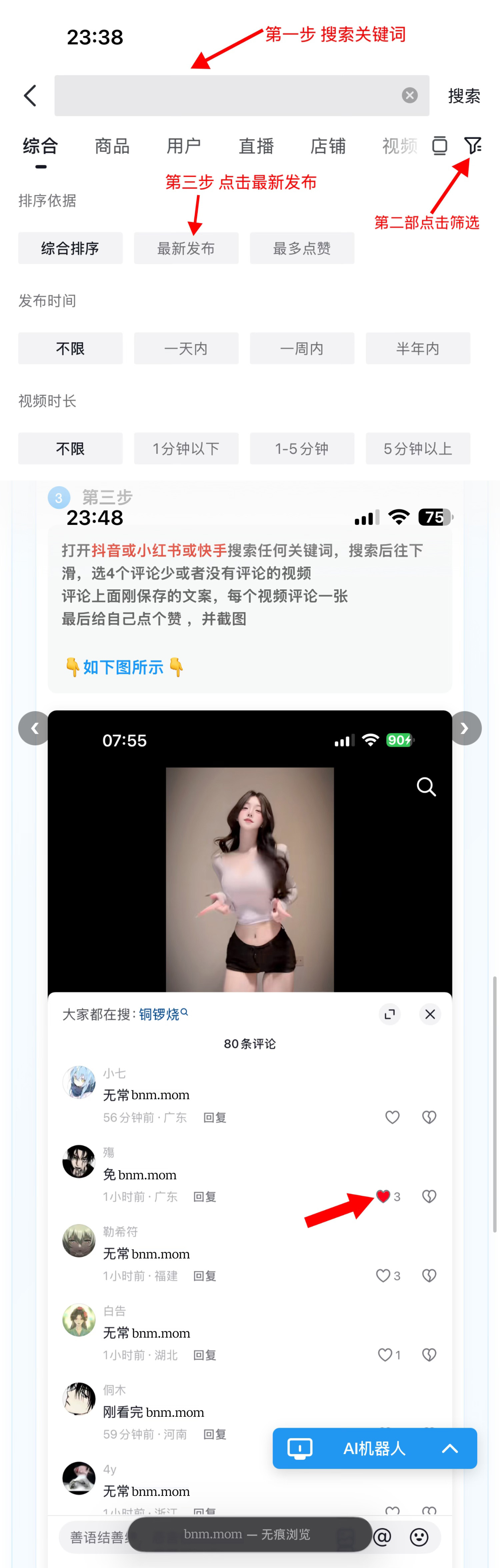 打开抖音或小红书或快手搜索任何关键词,搜索后往下滑,选4个评论少或者没有评论的视频